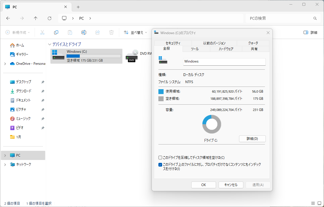 SSDは56GB/231GBが使用状態です。大きなデーターを入れなければ大丈夫だと思いますが、写真や動画を沢山いれるとパンクしそうです。外付けHDDをつないで使った方が良いかもです。