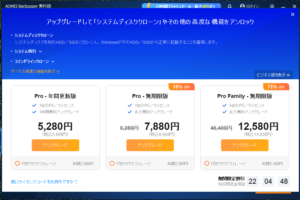 昨年9月に東芝 DynabookのSSD換装をやった時は AOMEI Backupper Standard を使いましたが、その後、有償化されたようでライセンスを購入しないとクローン化が始まりません。(-_-;)