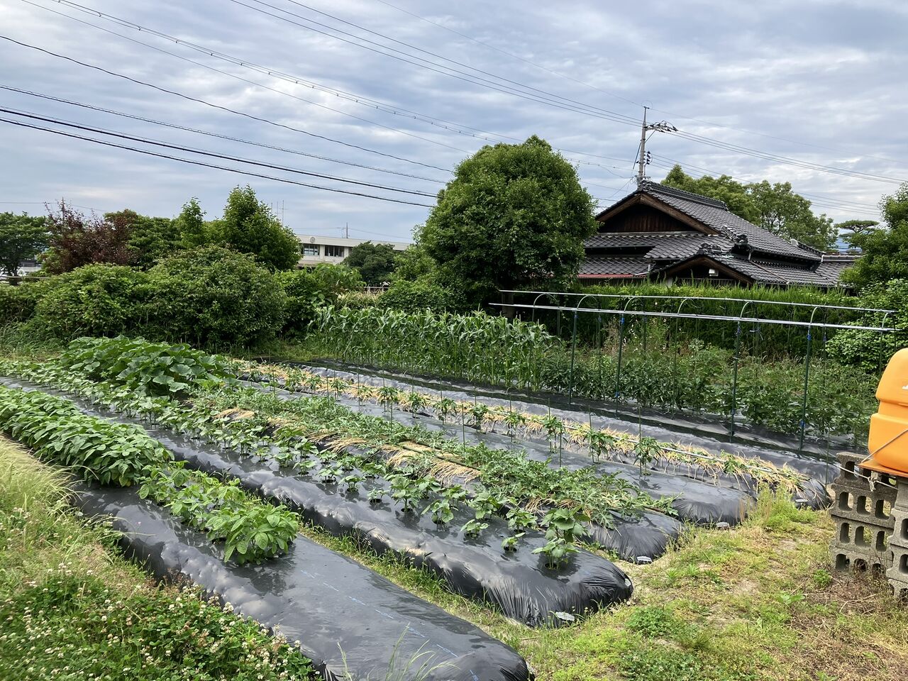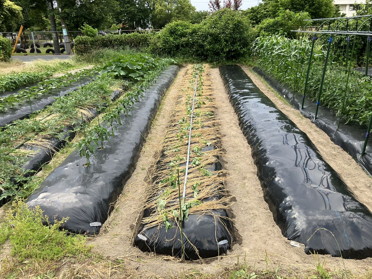 左からエダマメ、オクラ、スイカ/カボチャ、ピーマンです。スイカ、カボチャは朝に受粉作業をやっています。ピーマンは1番果を10個くらい収穫しました。