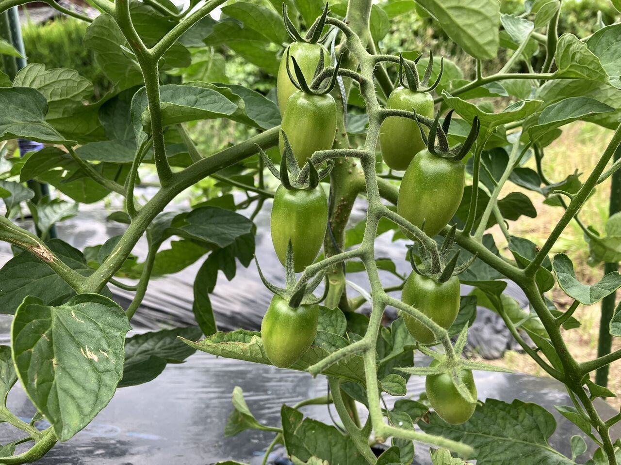 ミニトマトは実が大きくなってきました。カラスが狙って来るので赤くなりだす前に防鳥ネットを張らないといけません。