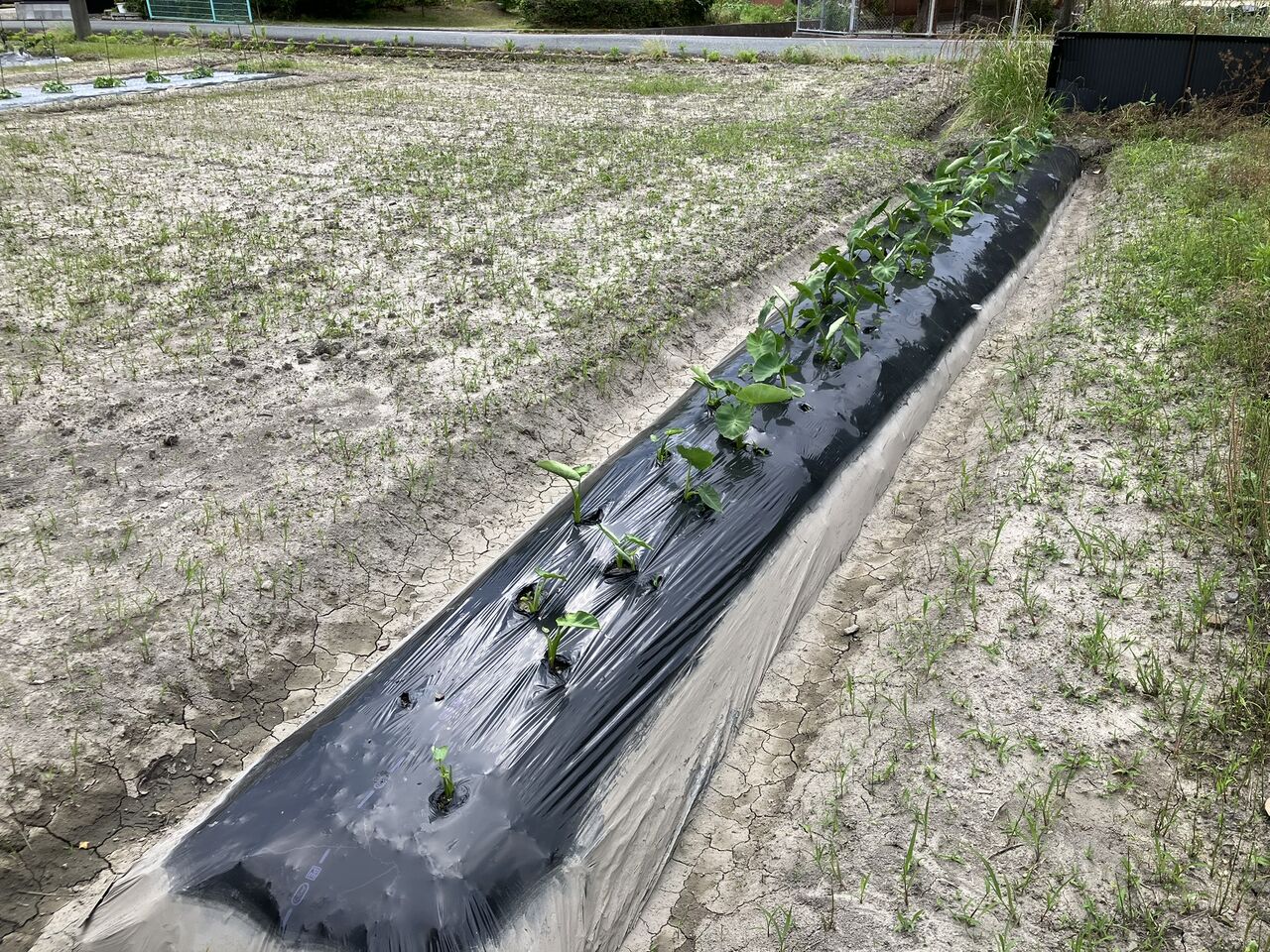 左がソラマメを植えていた畝です。次はサツマイモを植えるので、肥料は苦土石灰とケイ酸カリだけで窒素肥料は入れませんでした。