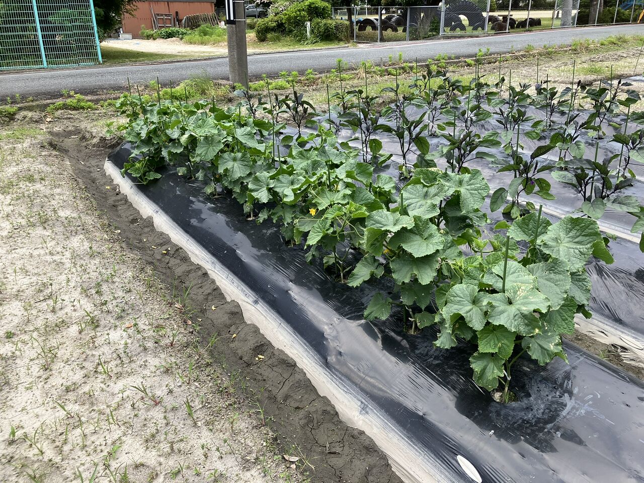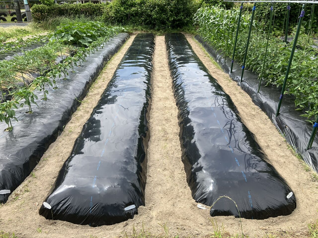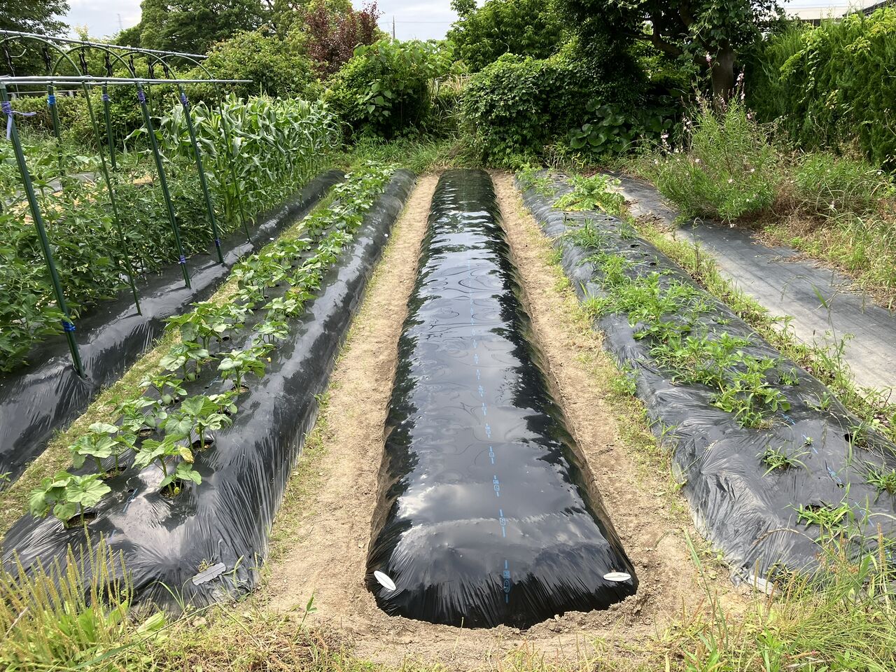 畝を耕して肥料を入れてマルチを掛けました。