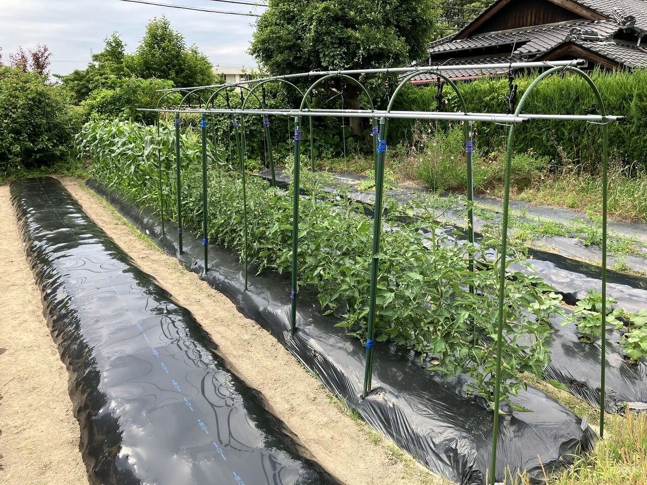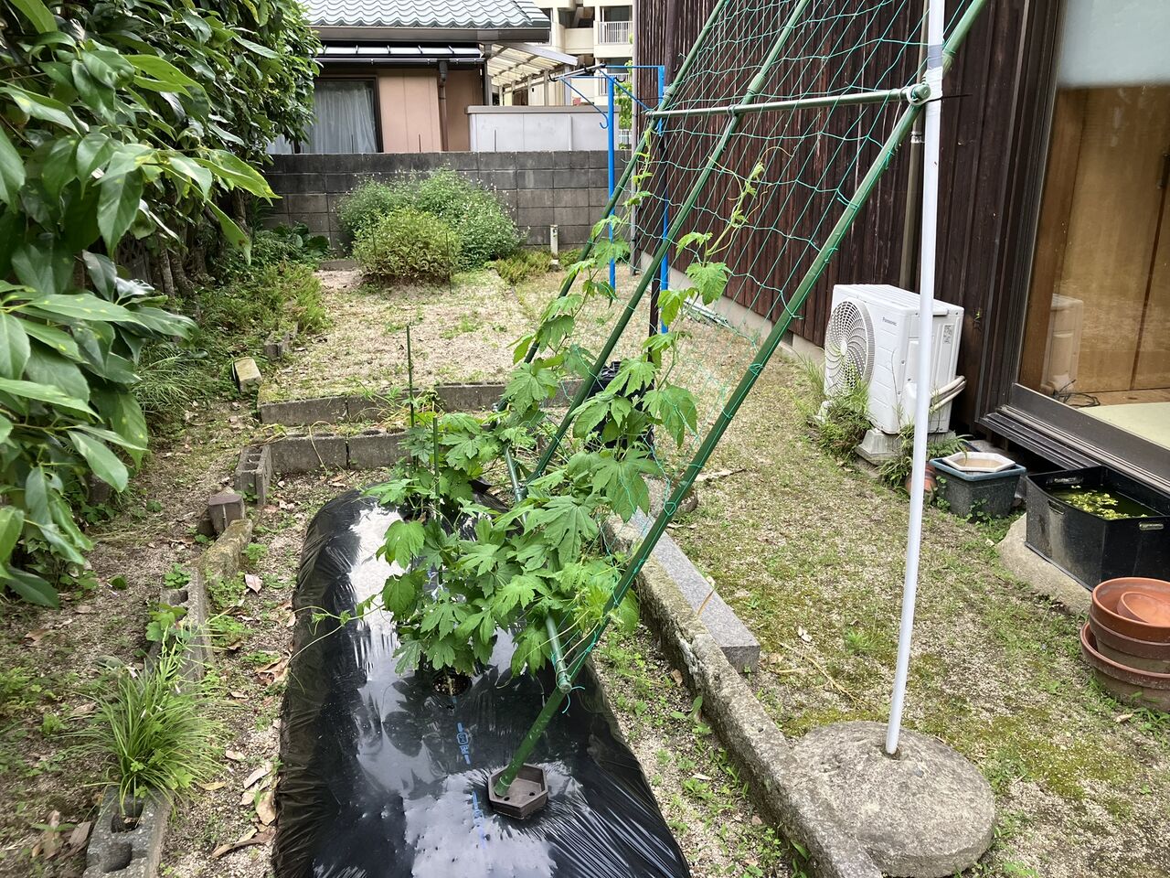 ゴーヤはツルが伸びてきましたが、まだ花が咲いてないので実が生るのはだいぶ先です。