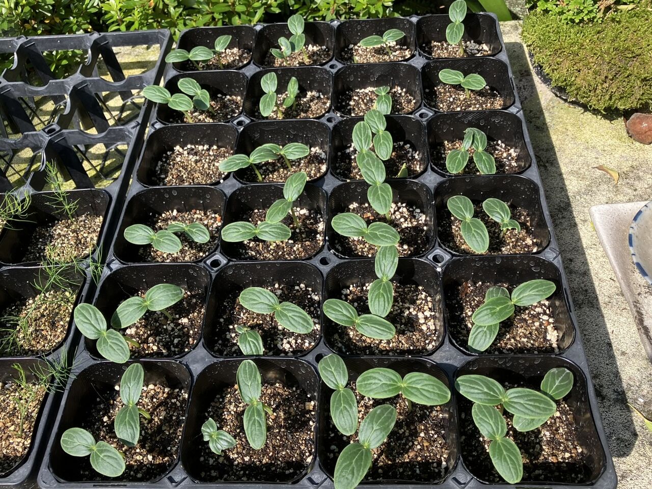 右のオクラは6月7日に種蒔きして、4粒/植穴で蒔いてほぼ全穴の種が発芽しました。3本に間引いて育てます。