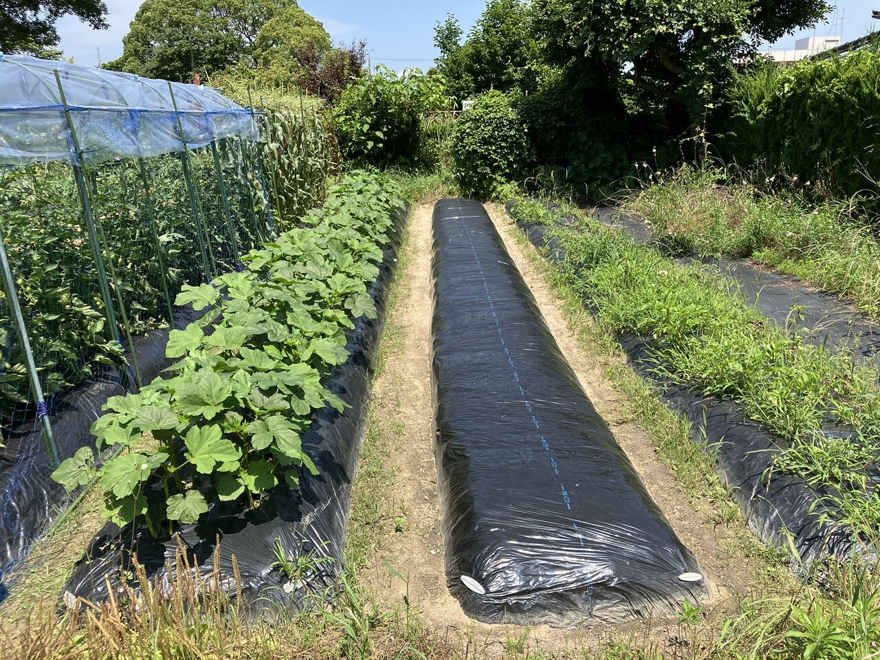 シートはトンネル栽培用の150cm幅のフィルムシートをかけました。横幅が長いので垂らした状態で付けました。