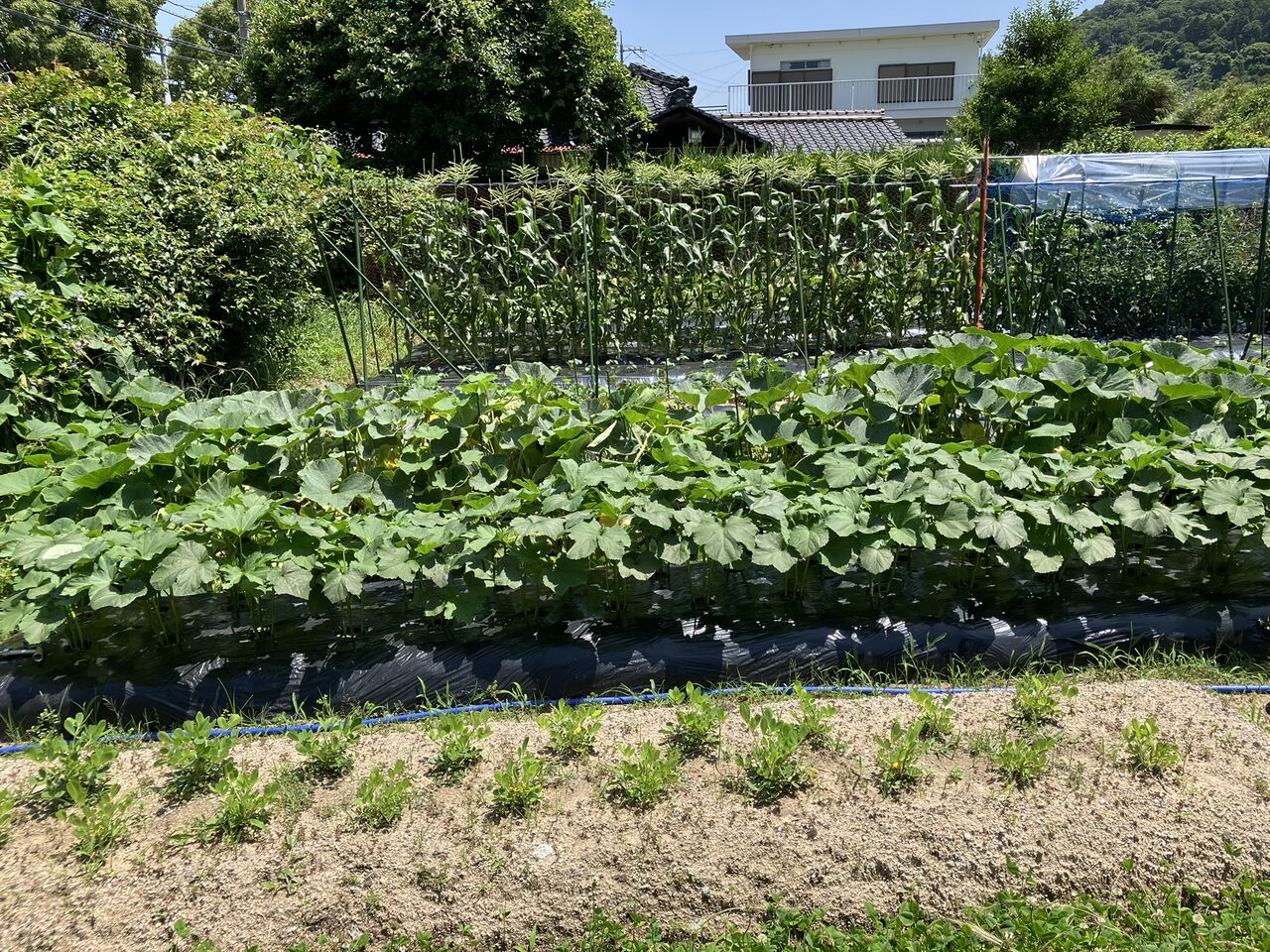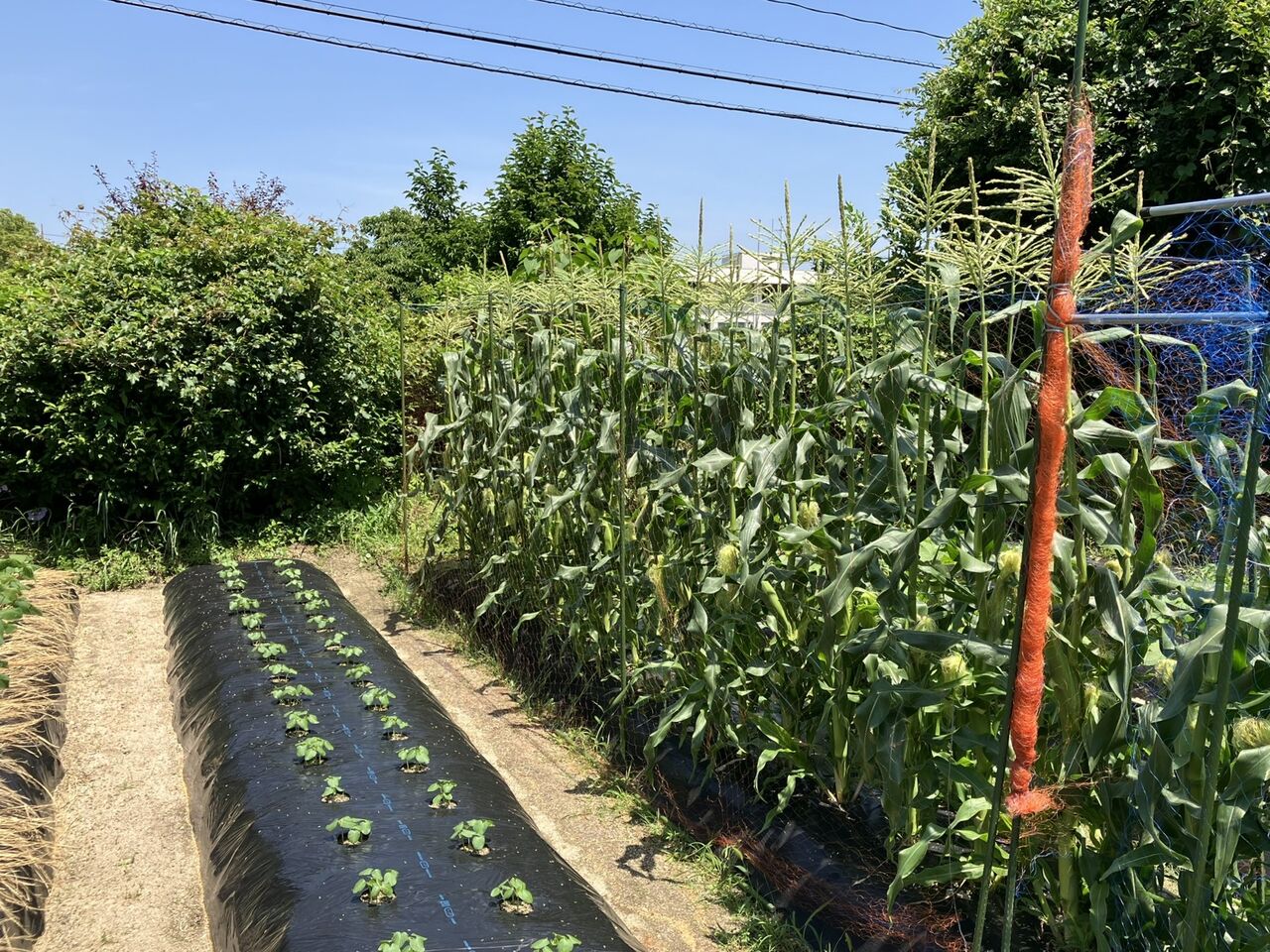 昨年まではスィートコーンの実にミカンネットをかけていたのですが、昨年はカラスがミカンネットを引きちぎって実を食べるようになったので、後半は防鳥ネットをかけました。