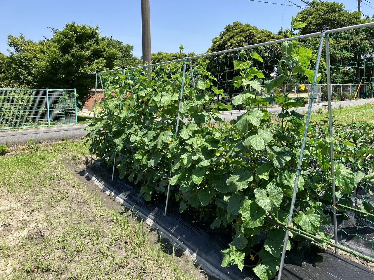 キュウリは6月7日に支柱を立てて、キュウリネットを張りました。