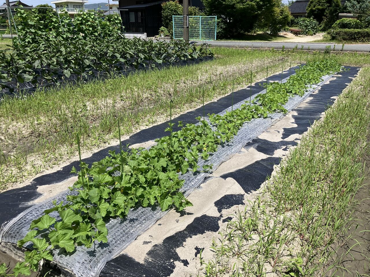 ピーマンは6月11日にV字支柱を立てて、一段目の誘引ヒモを張りました。これから4本仕立てにしていきます。6月6日に植えたサツマイモは植付後に雨が続いて全株が活着しました。