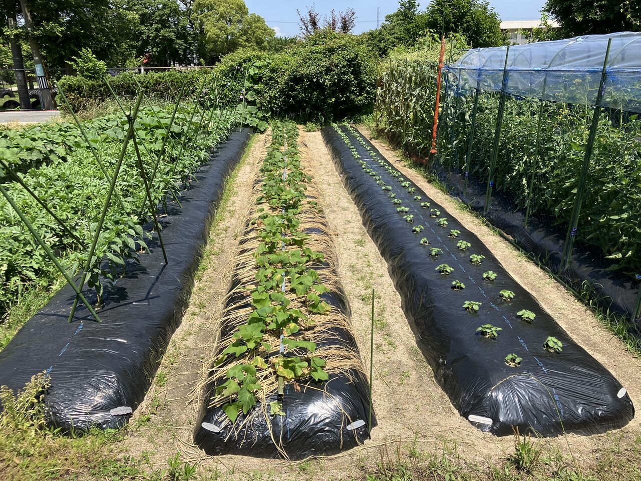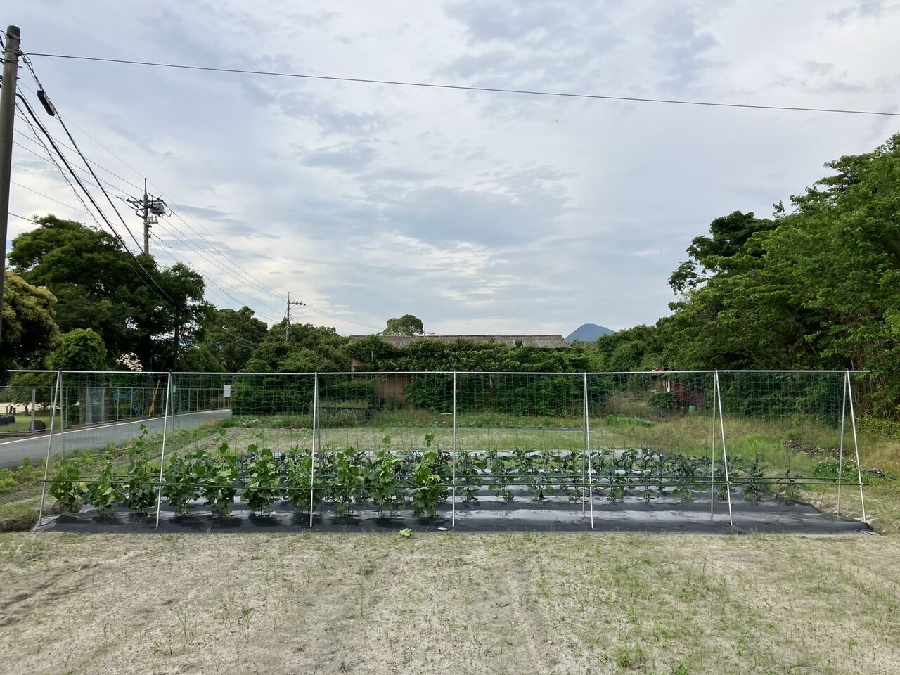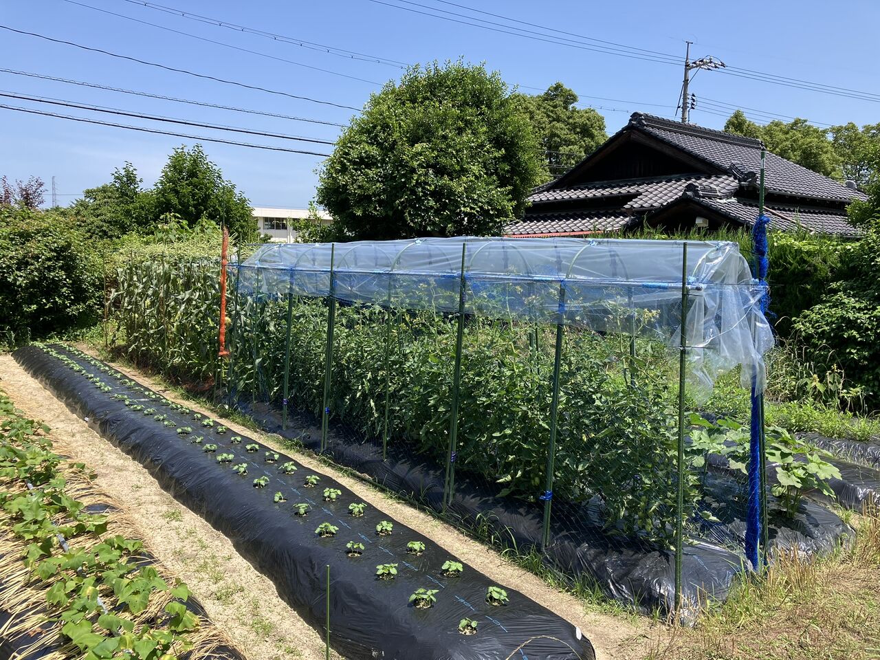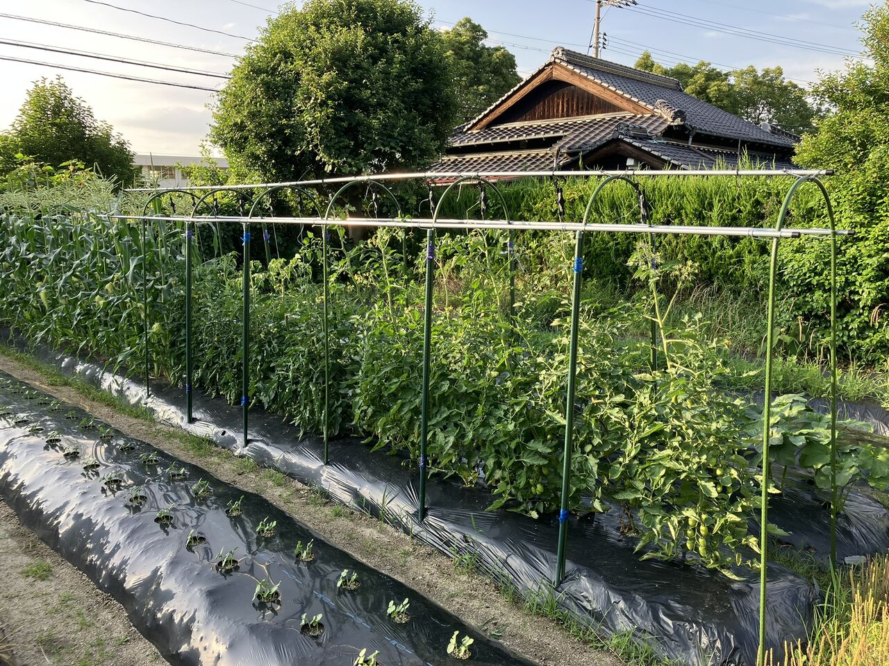 最初に先送りにしていたトマトの雨除けシートを付けました。雨除けの支柱は5月27日に立てたのですが、シートをかけてありませんでした。