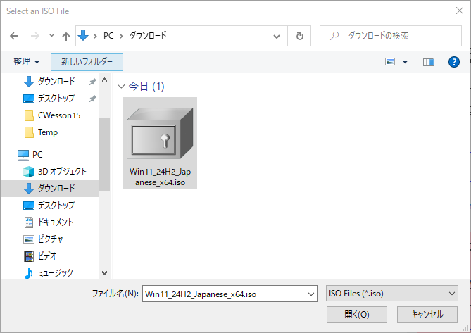 ファイル選択画面になるのでダウンロードしたISOファイルを指定します。