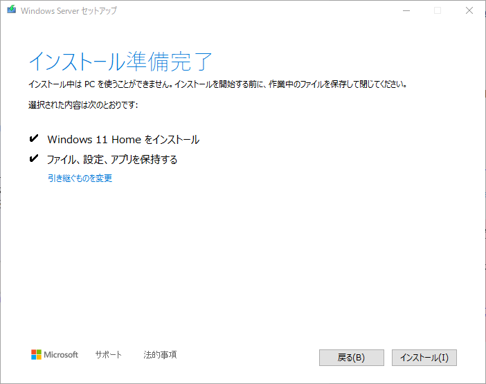 「インストール準備完了」となるので、チェック項目を確認して[インストール]に進みます。