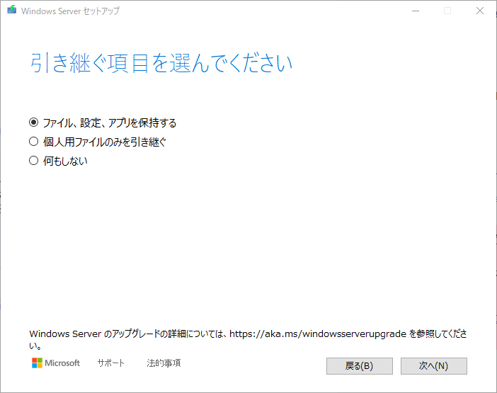 途中の「引き継ぐ項目を選んでください」画面では「ファイル、設定、アプリを保持する」を選びます。