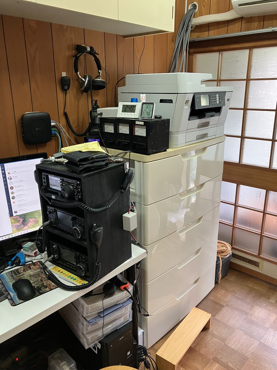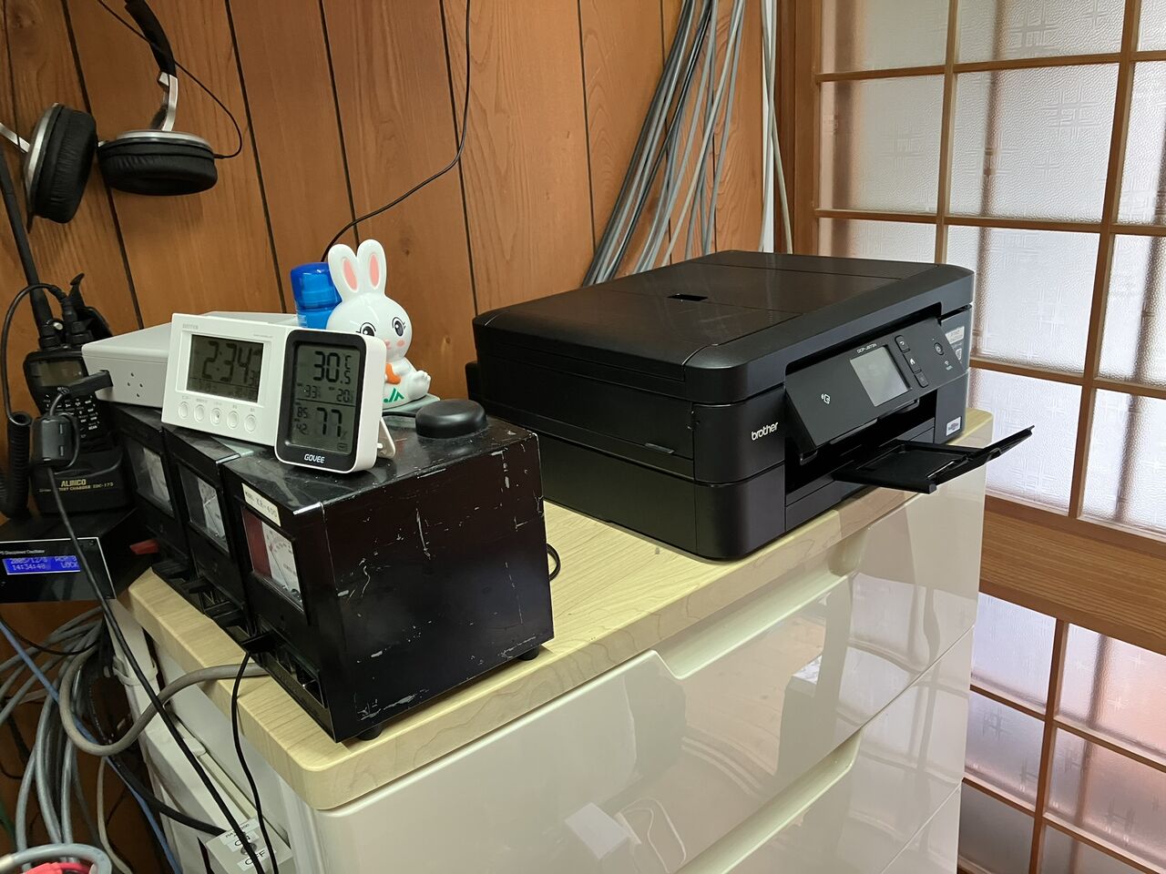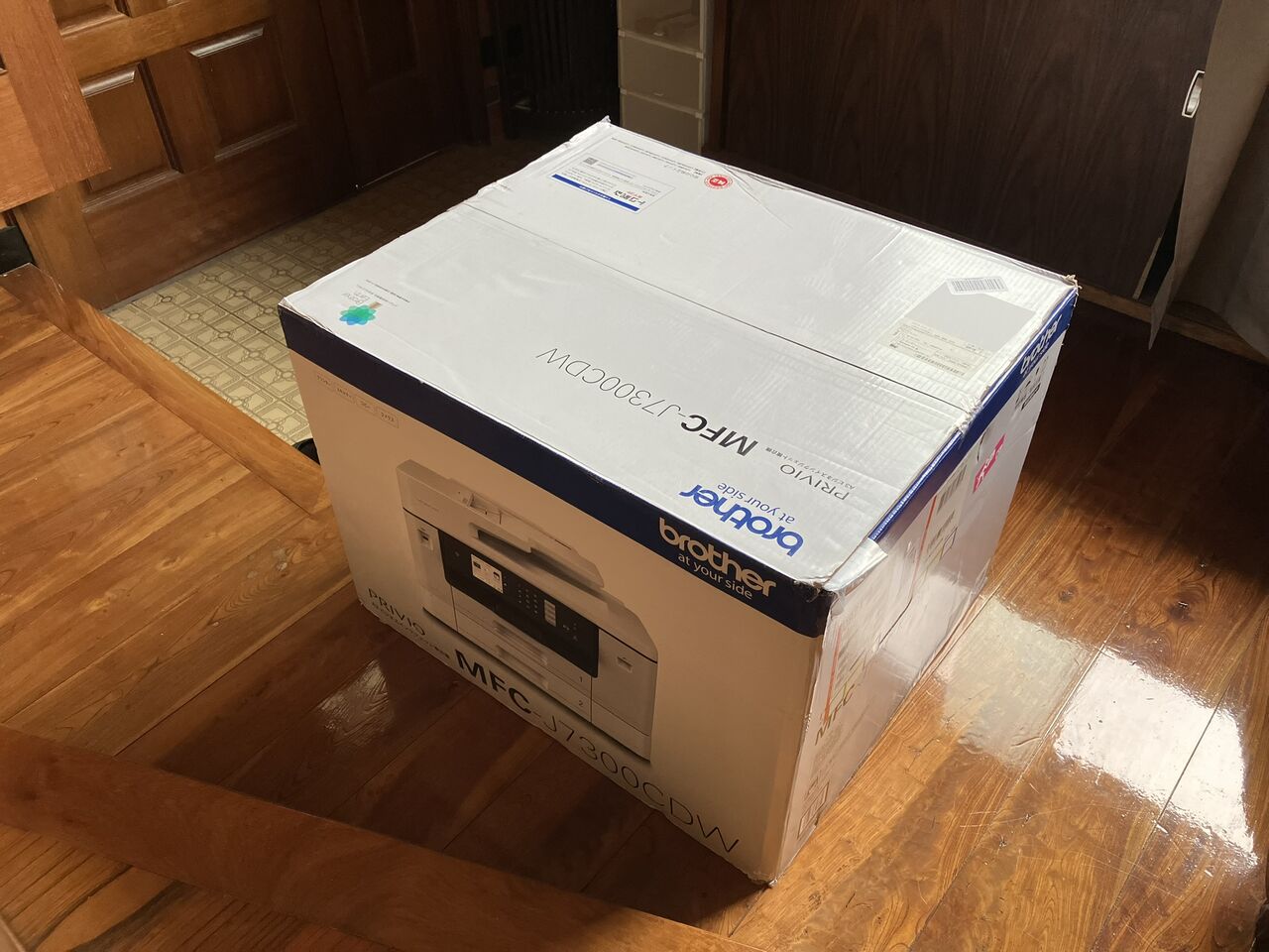 旧のDCP-J973Nは自室の5段チェストの上に置いてありました。チェストはアイリスのHG-805Bというもので、中には部品や資材を入れています。届いたMFC-J7300CDWです。かかえてみたらとても重くて一人では設置出来そうもありません。