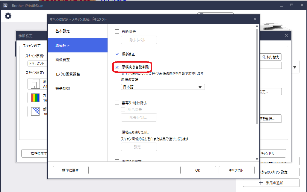 ファイルへの取り込みの原稿補正で「原稿向き自動判別」が設定されていないのでチェックを入れました。