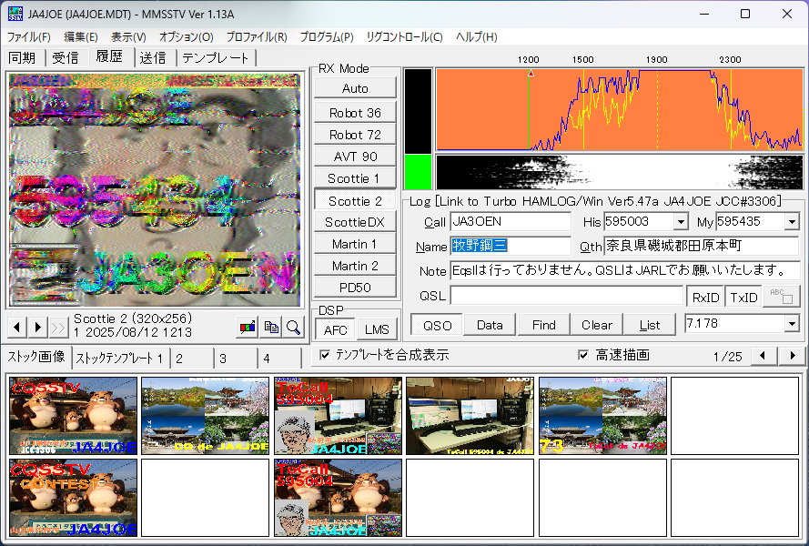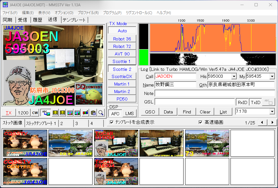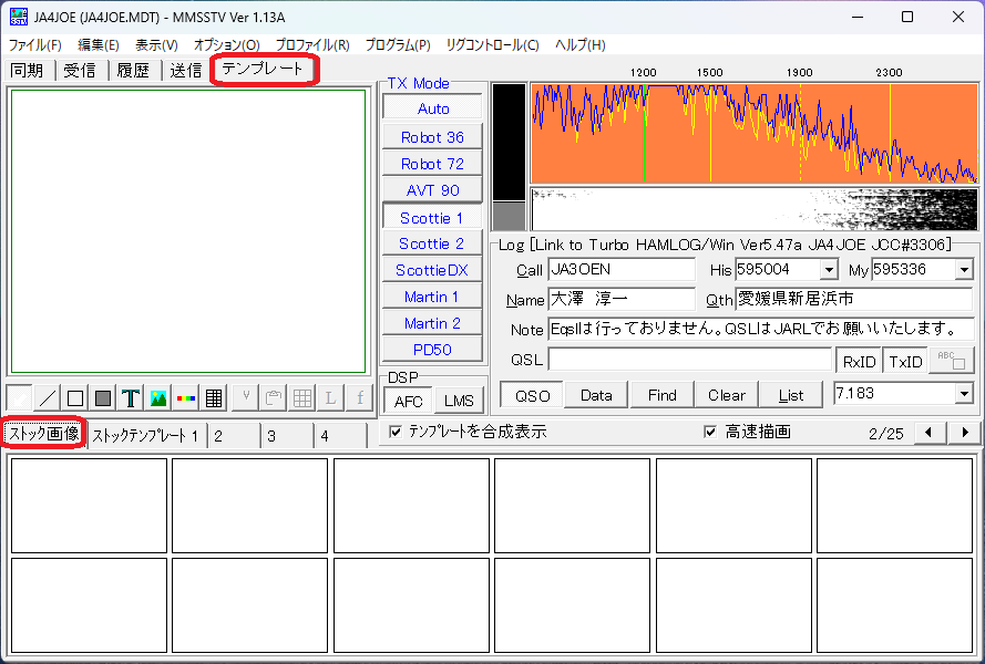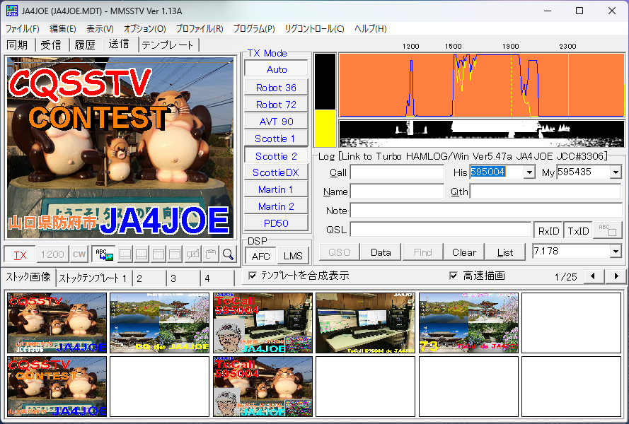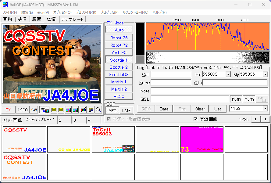 こちらからCQを出す交信はCQ用のテンプレートを選んで送信します。TX MODEはScottie 2を指定します。