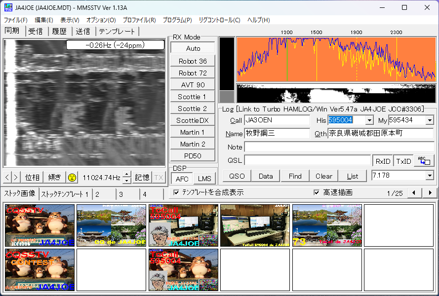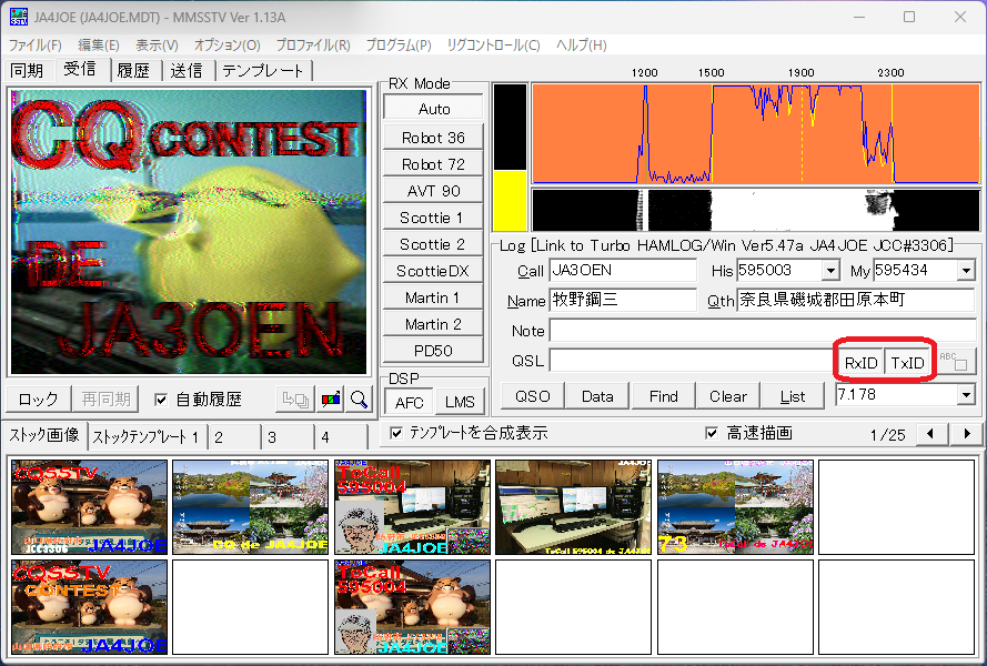 相手コールサインはSSTV信号(FSKID)に入っているのでCQ画像受信時に自動的に設定されます。(入ってない場合は手動で入力してください。)