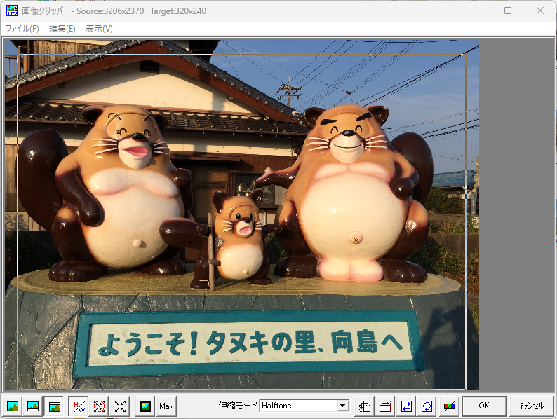 JPEGファイルをドラッグすると画像クリッパー画面が開くので、マウスの左ボタンを押しながら適当な部分を選んでOKを押してサイズ変換します。