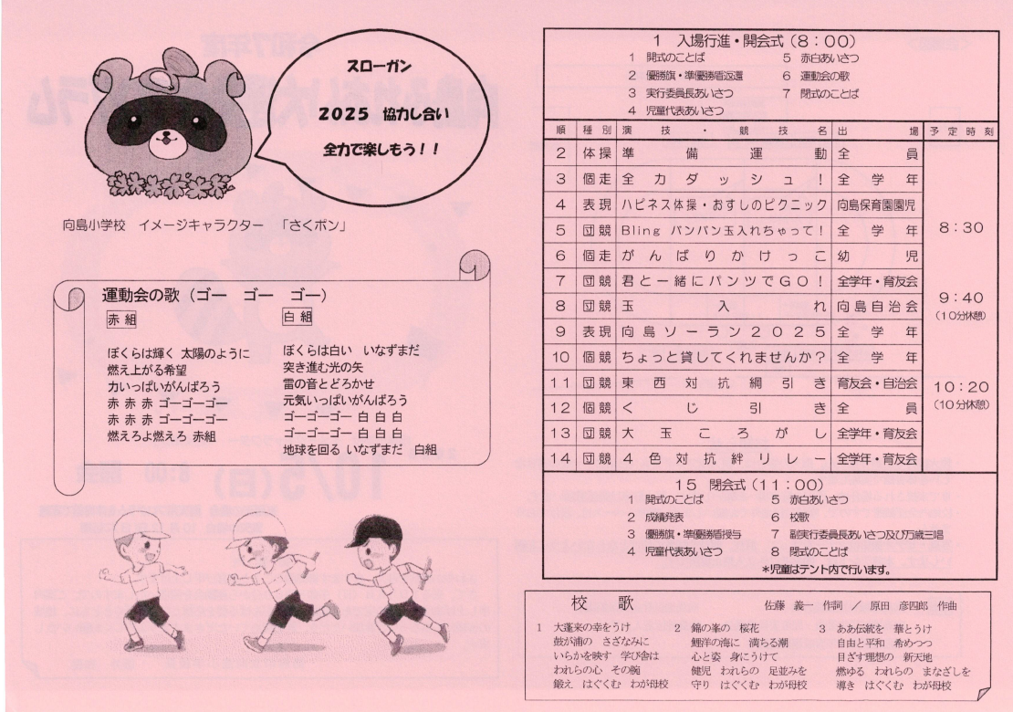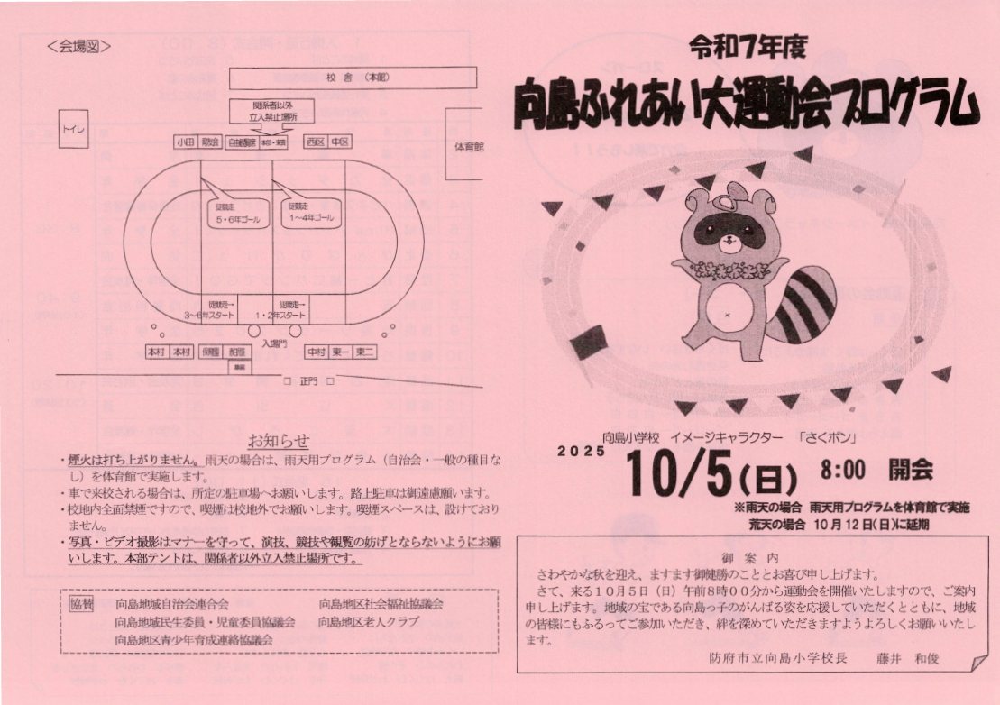 今日は向島小学校で「向島ふれあい大運動会」がある予定だったのですが、昨日の雨で運動場がぬかるんで使えないので中止になりました。児童と父兄だけで体育館で実施できる競技だけ実施するそうです。