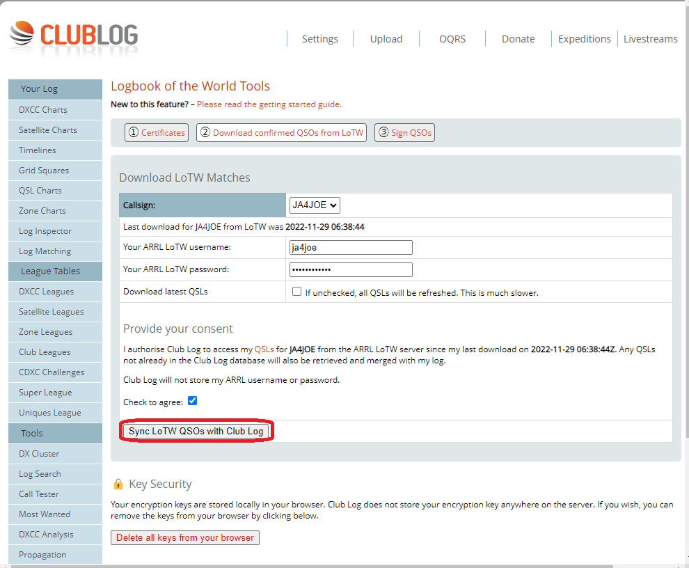 コールサインとLoTWのパスワードを入力して [Sync LoTW QSOs with Club Log] で同期を開始します。