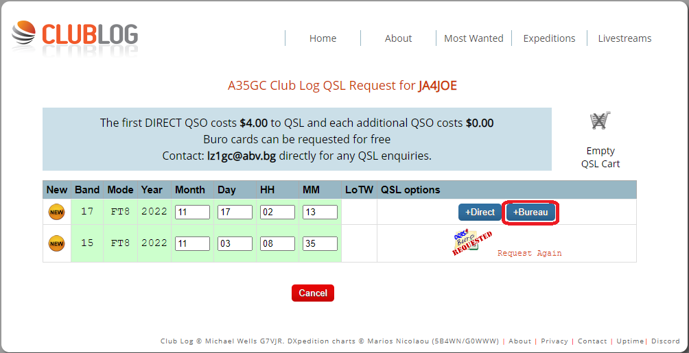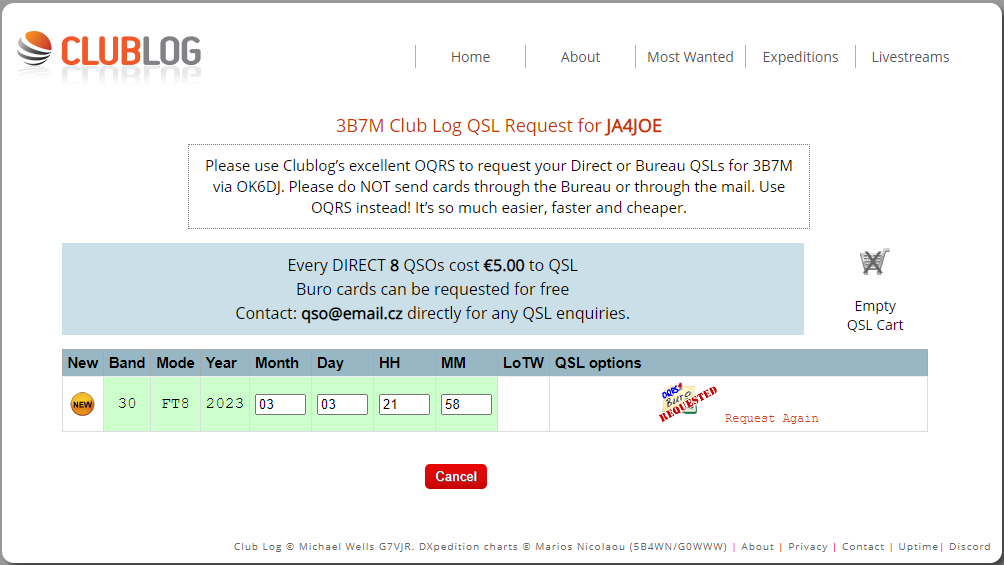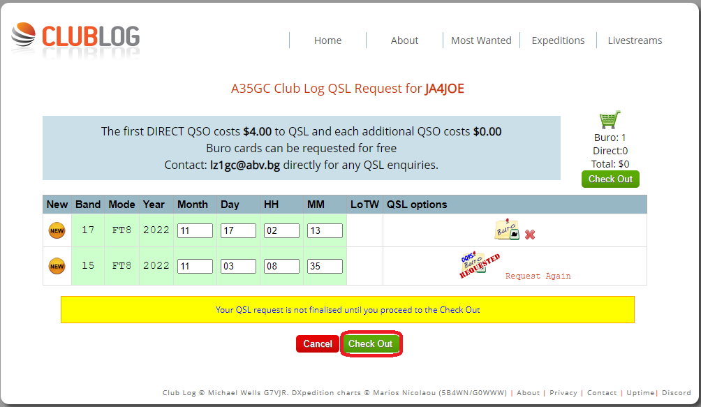 ClubLogのOQRSを使っているDXペディション局とQSO出来た場合、OQRSでリクエストする事でQSLカードを送付してもらえます。LoTWへのログアップロードは無料の場合もありますが、有料のQSLカード送付リクエストを行うとアップロードしてもらえる場合があります。