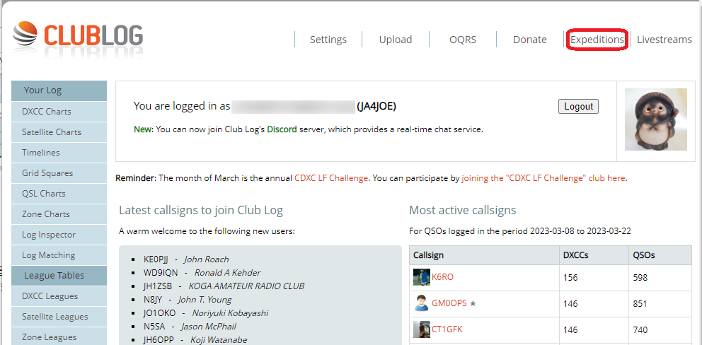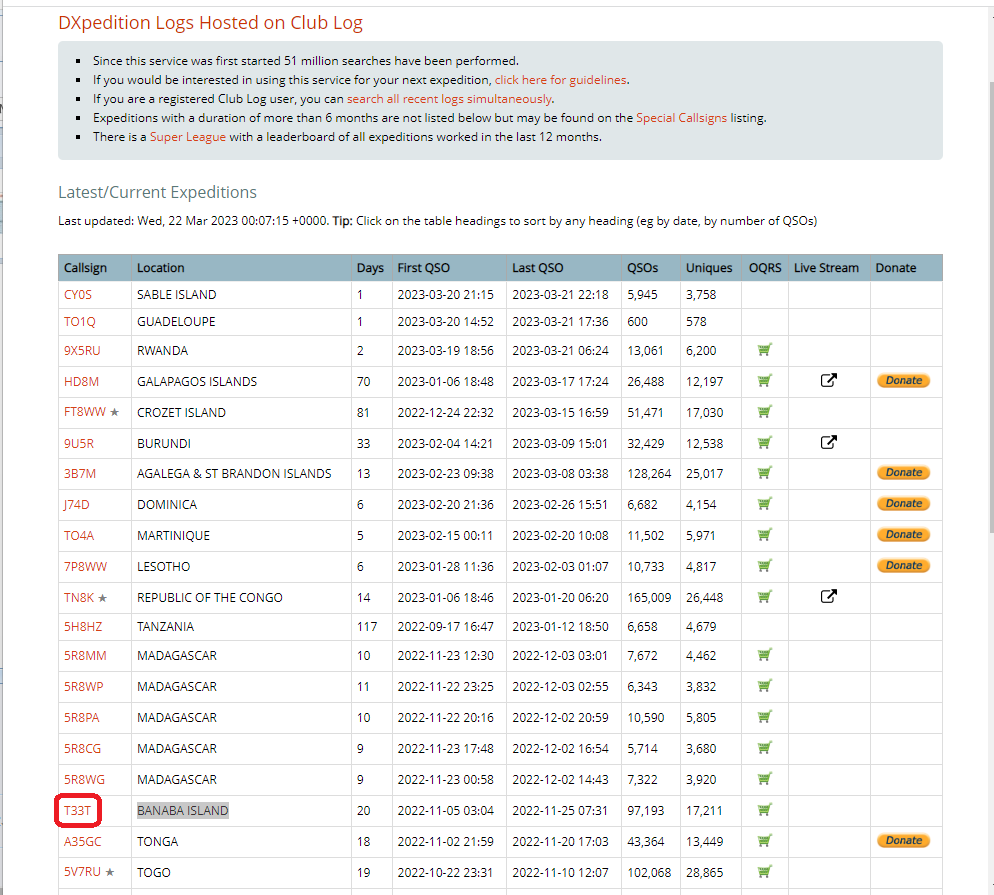 上の [Expeditions] から最近のDXペディション一覧を表示します。