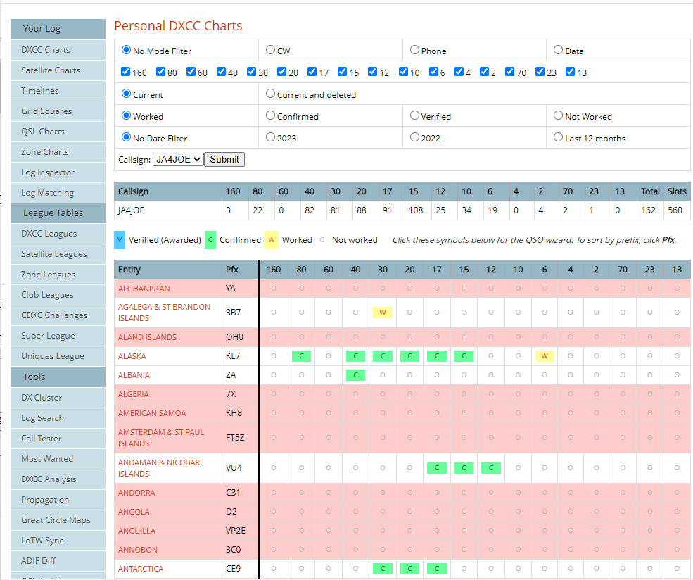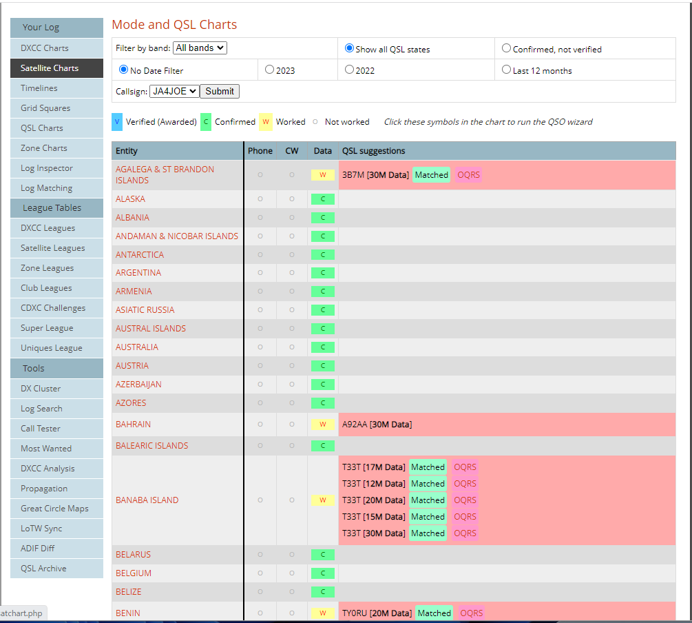 左側メニューの [QSL Charts] から Mode and QSL Chart を表示します。