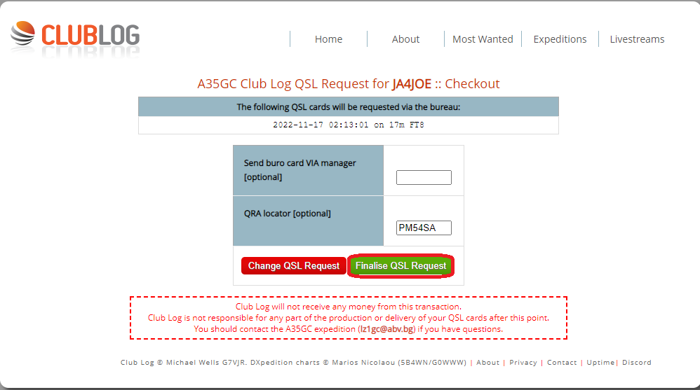 [Finalise QSL Request] でリクエスト完了です。