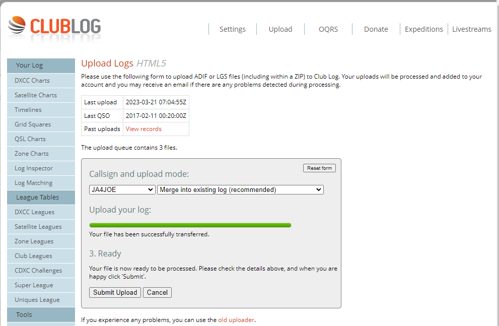 ログのアップロードは以下のような方法があります。・ADIFファイルをアップロードする。
