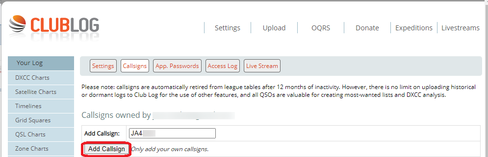 自分のコールサインを追加します。