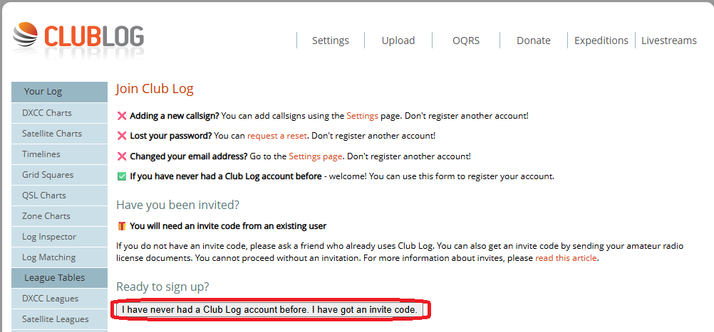 ClubLogのユーザー登録手順が変わって、ユーザー登録にClubLogの既存ユーザーの Invite Code (招待コード)が必要になりました。知り合いに 既存ユーザーがいない場合は、ClubLogのヘルプデスクに無線局免許状の画像を送信して Invite Code を取得する事も出来ます。