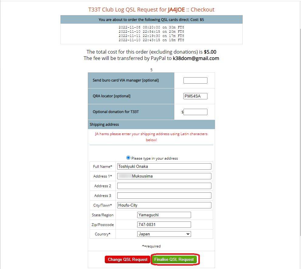 名前、住所を設定して[Finalise QSL Request] で進みます。