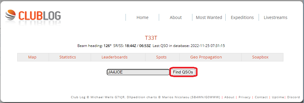 [Find QSOs] をクリックします。(この画面をDXペディション期間中一時的にブックマークしておくと便利です。)