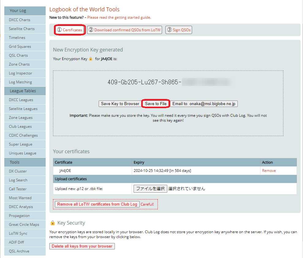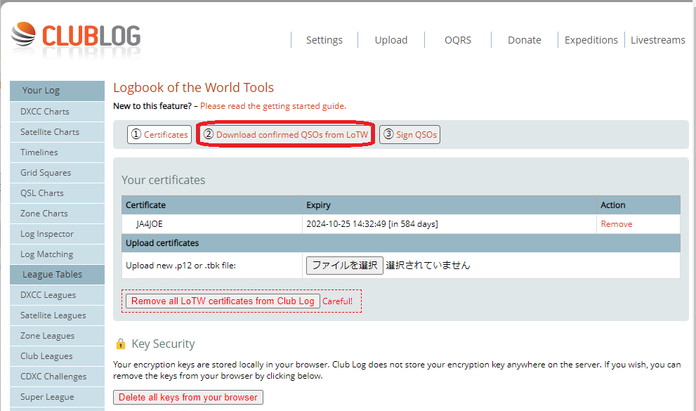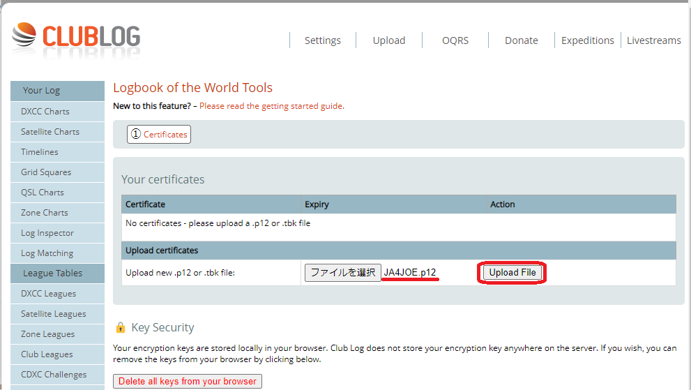 LoTWの .p12 ファイル、または .tbk ファイルを選択してアップロードします。.p12 ファイルはTQSLから出力できます。