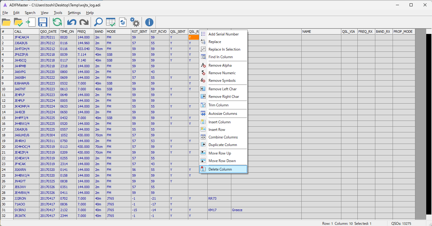 HMLOGから出力したADIFファイルを別フォルダーにコピーしてからADIFマスターで開いて、 [QSL_RCVD]のカラムの上で右クリックして [Delete Column] で消します。
