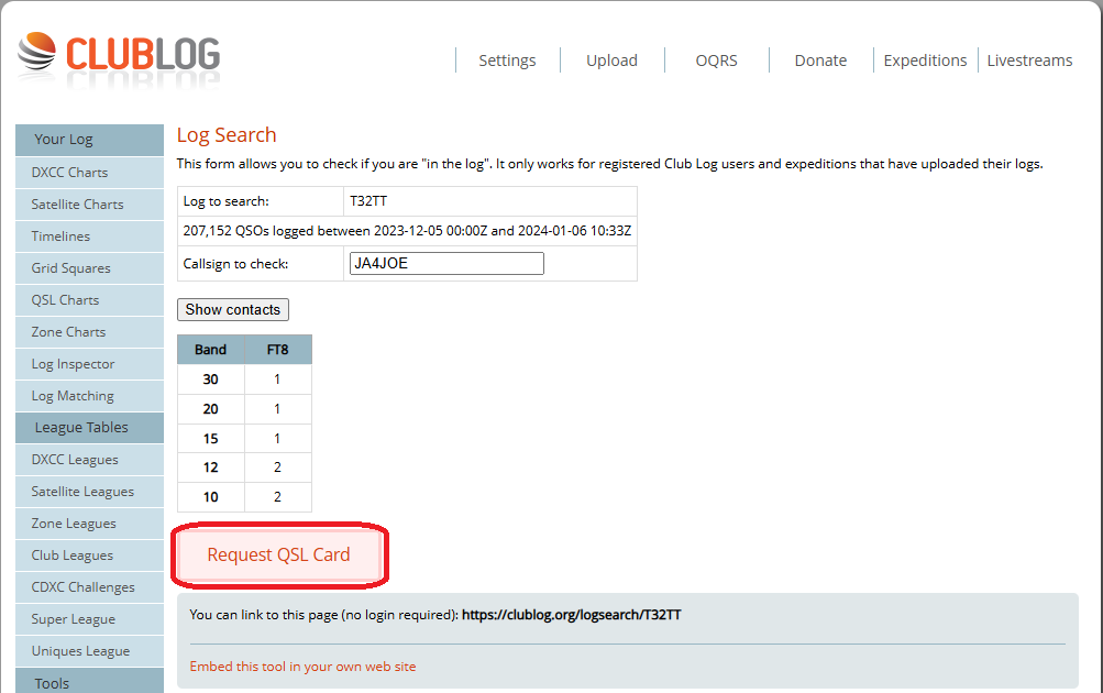 上記では [Expeditions] から最近のDXペディション一覧を表示してOQRSリクエストしましたが、他にQSL Chartから過去の交信分について確認してOQRSリクエストする事が出来ます。