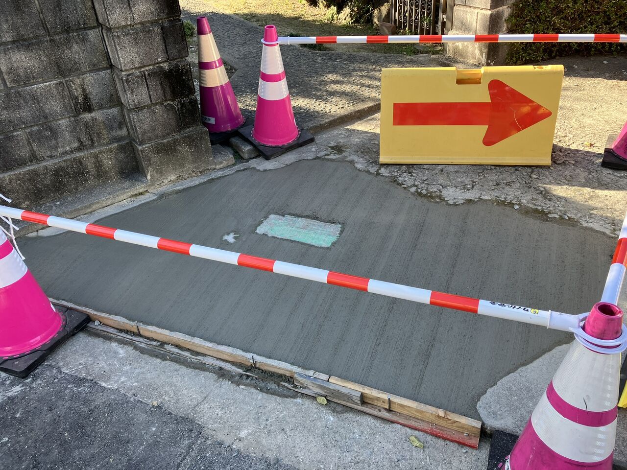 門の前の地面のコンクリを打ってくれました。固まるまで周辺に三角コーンを置いて入れないようにしてあります。