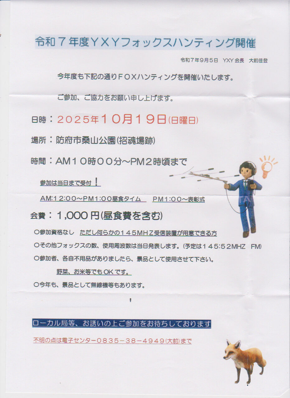 今度の日曜日に所属している防府アマチュア無線クラブ JH4YXY のFOXハンティングが行われます。