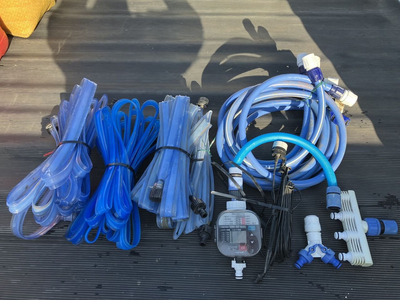 回収した自動水やり用機材一式です。散水チューブは洗って水を抜きました。