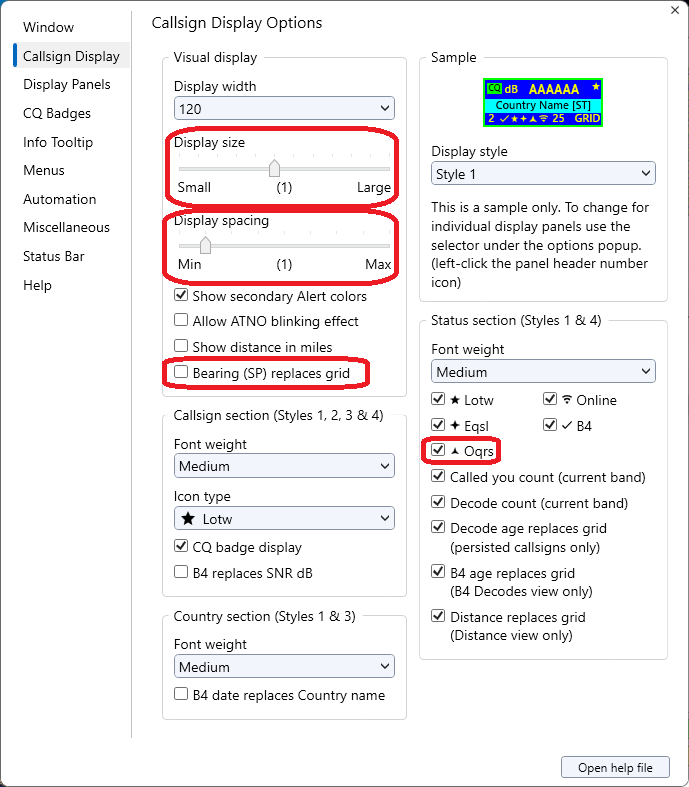 - コールサインウィンドウ表示タイル:グリッド表示の代わりに方位角(SP)を表示するオプション。全バンド、HFバンドのみ、またはVHF/UHFバンドのみに設定可能。デフォルトはオフ。