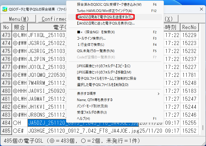 私の場合、hQSL受信後にhQSLを送っていない局には、hQSLを送信しています。照合結果画面で未送信のログを選んで、[【選択局】あて電子QSLを送信する] でhQSLを送信します。