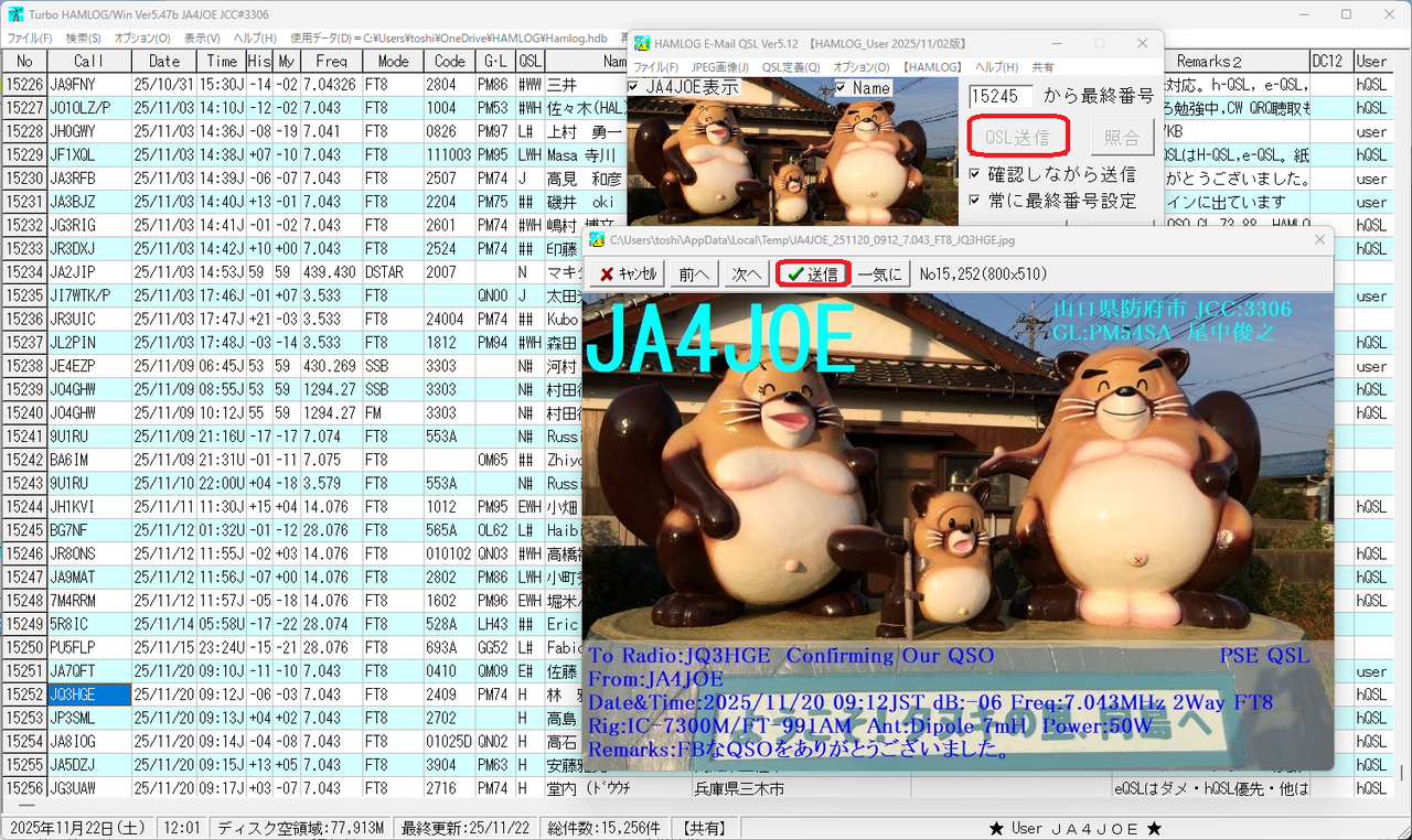 hQSLを送信してみます。相手がhQSLユーザーで、HAMLOGのQSL欄2文字目が空欄の局にhQSLを送ります。最後にhQSLの送信処理をしたログの次(例では15245)から最終番号まで([常に最終番号を設定]をチェック)を対象に送ってみました。[QSL送信] ボタンで送信先候補あてのカードが表示されます。