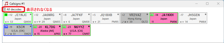 - 希望コールサインアラート #1:デコードされた任意の1x1コールサインでアラートするオプション