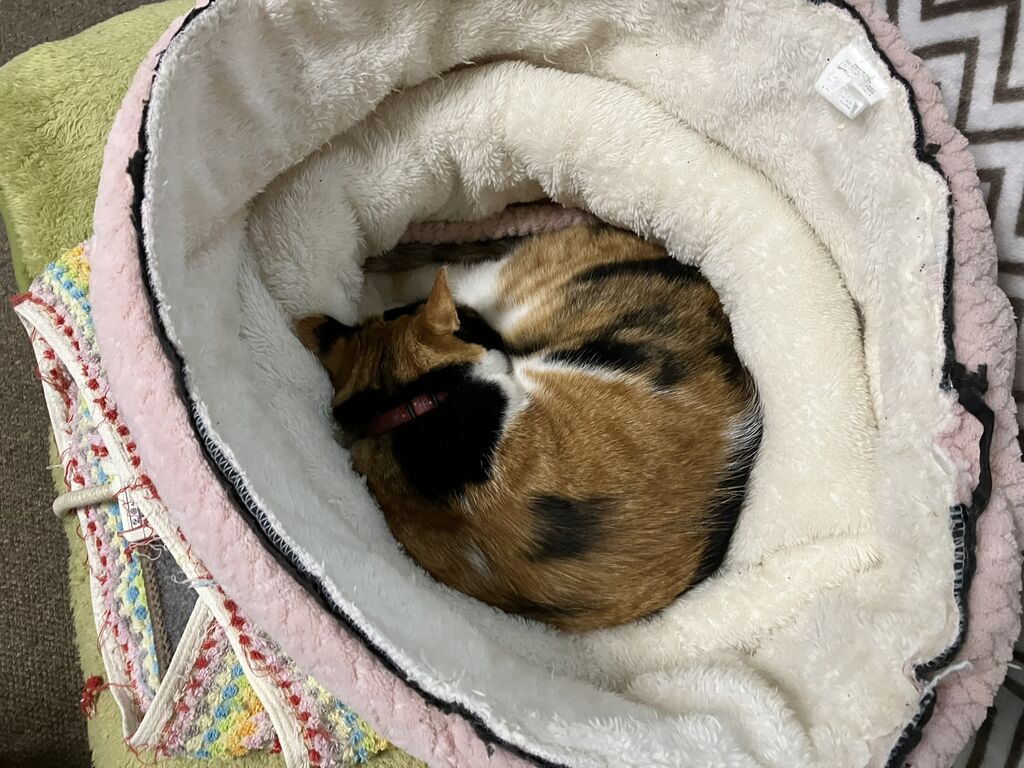 ホットカーペットの上にベッドを乗せてあげると、ベッドで丸くなって寝ています。