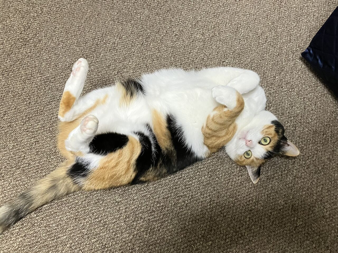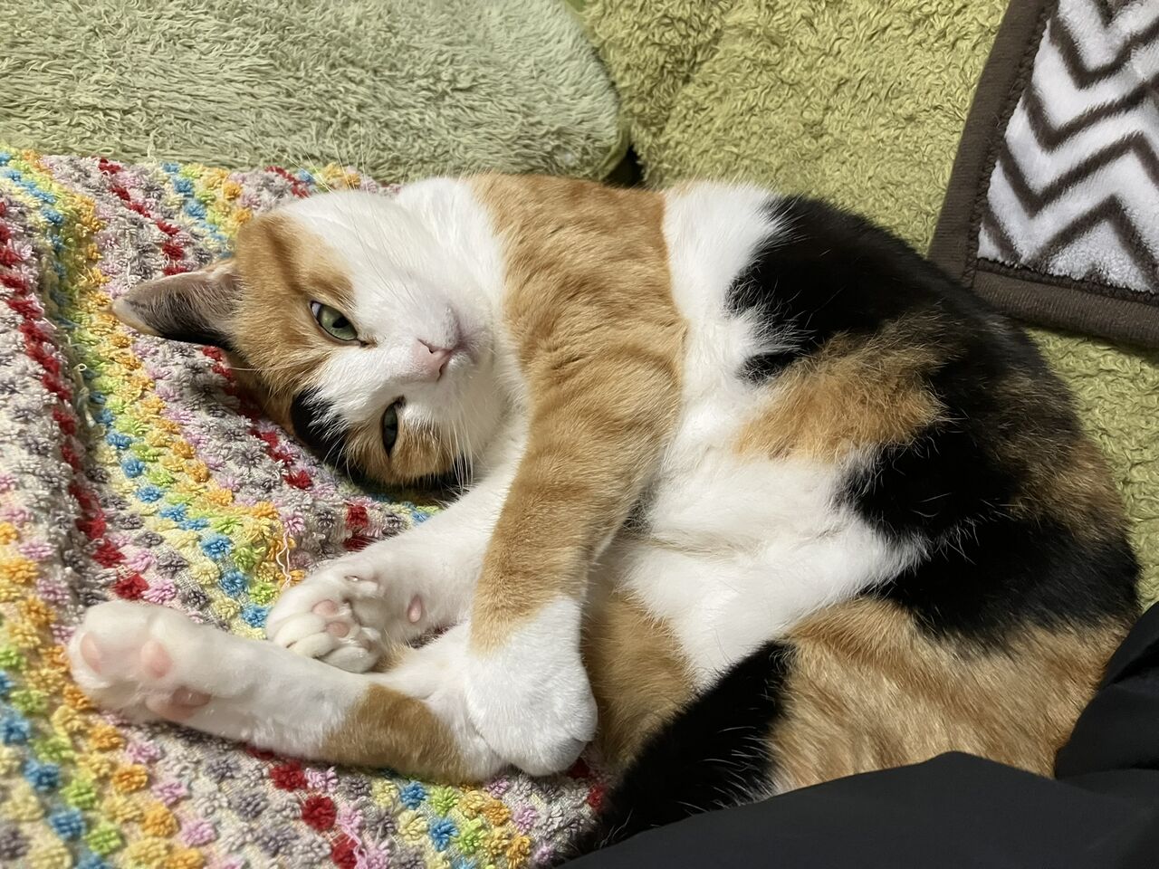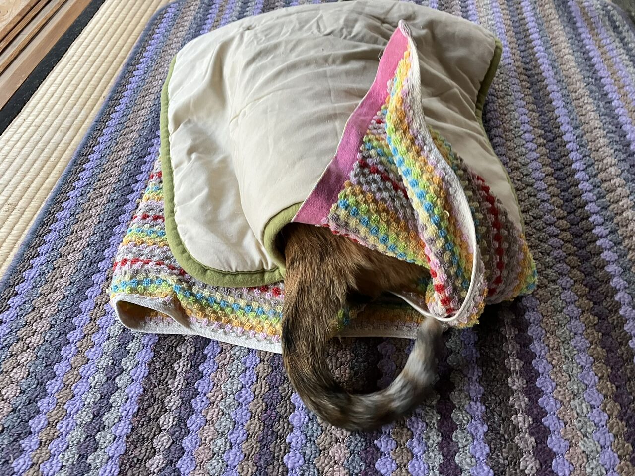 寒くなってホットカーペットを出しました。潜って寝るのが好きですが、尻尾が出てます。(笑)