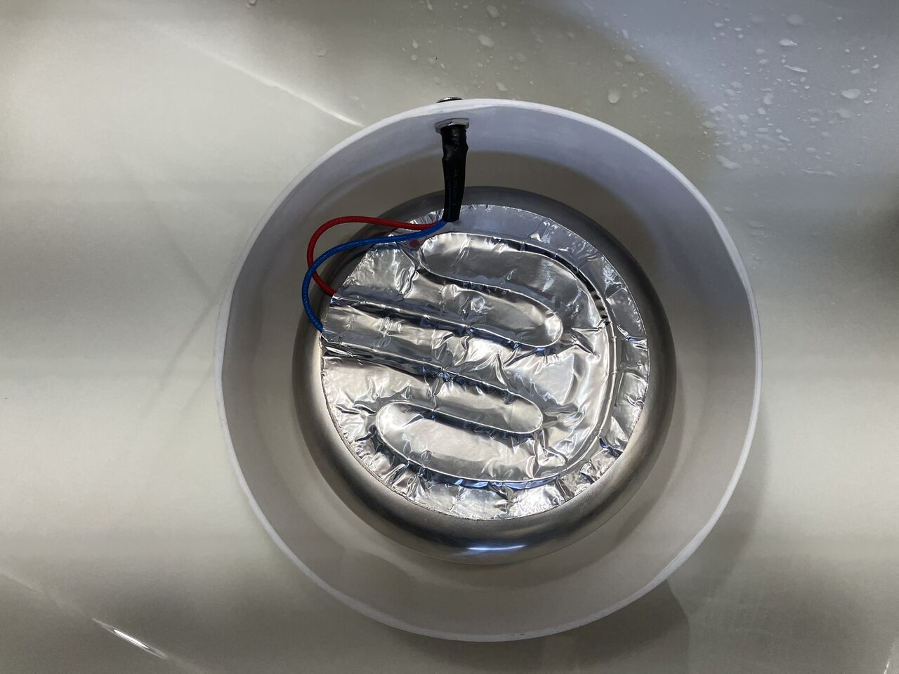 ステンレスボウルの裏に電熱線が貼ってあります。簡単な構造なのでDCジャックは簡単に交換出来そうです。