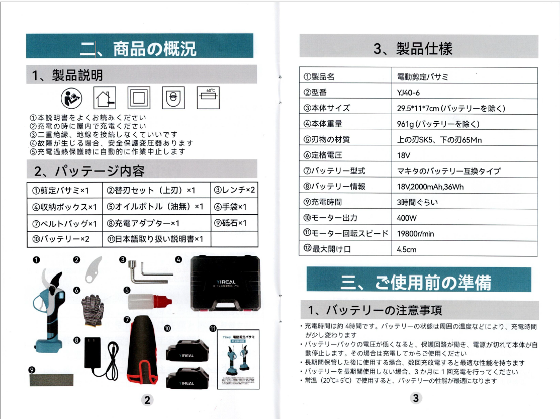 電動剪定バサミ 切断径40mm 2段階開き角度調節可 マキタ18V互換 4000mAh大容量バッテリー付