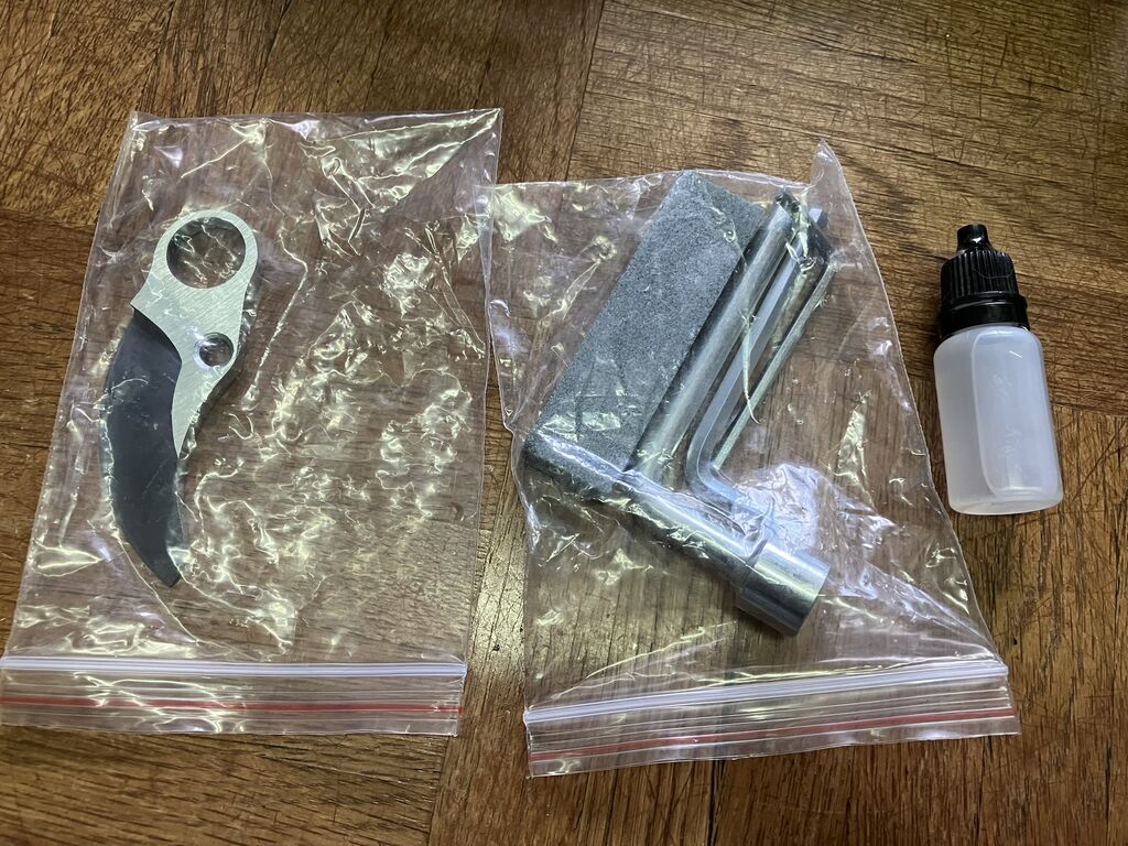 替刃、砥石、レンチ、オイルボトルです。レンチは替刃の交換や締め付け調整に使います。