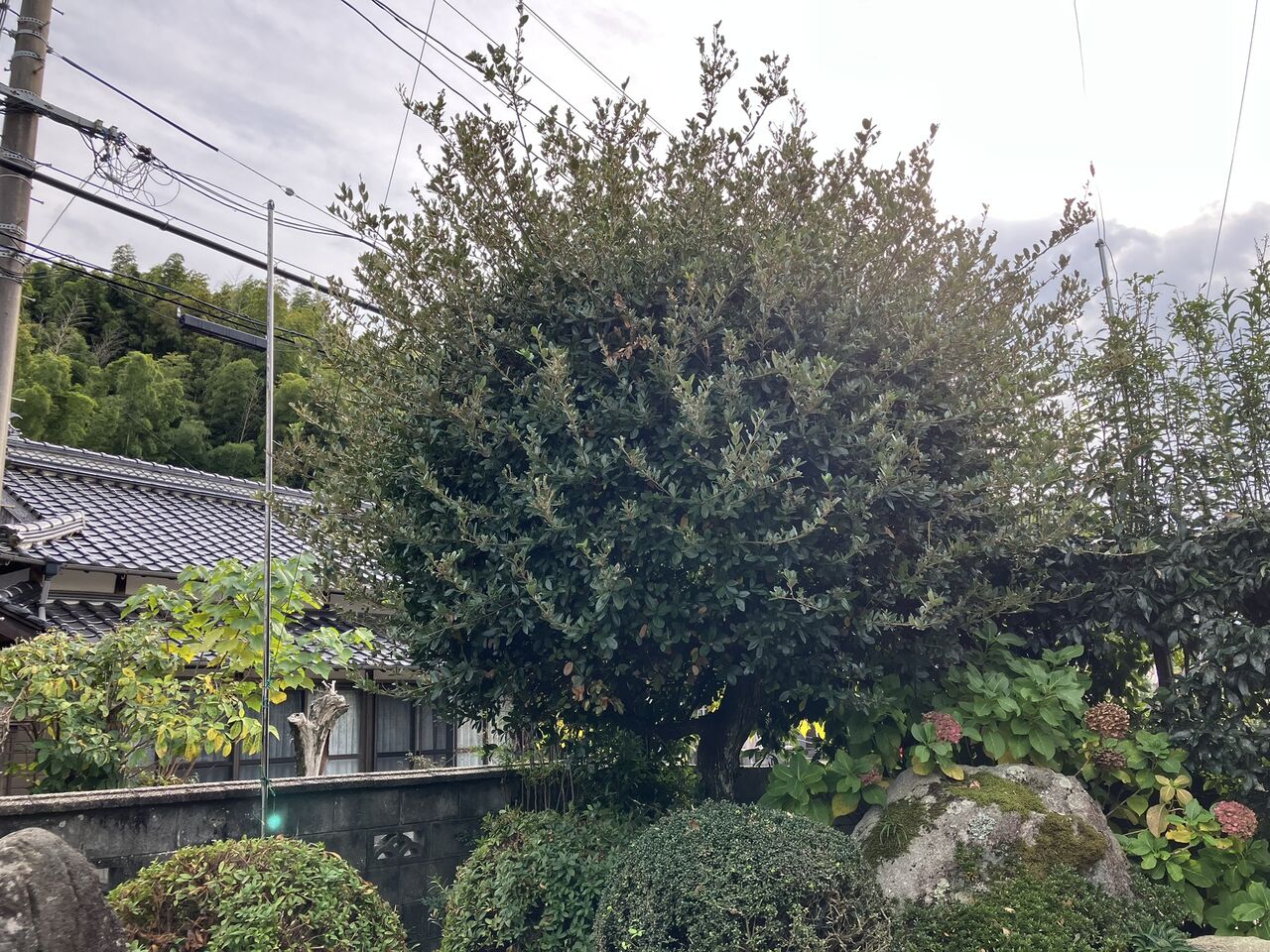 庭南西隅のウバメガシを剪定しました。ここから大型電動剪定バサミを入手したので、新しい大型電動剪定バサミとハンディーチェーンソーで太い枝を剪定しました。飛び出していた細い枝は電動ヘッジトリマーで剪定しました。