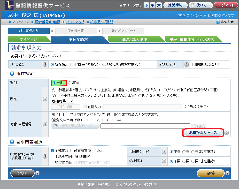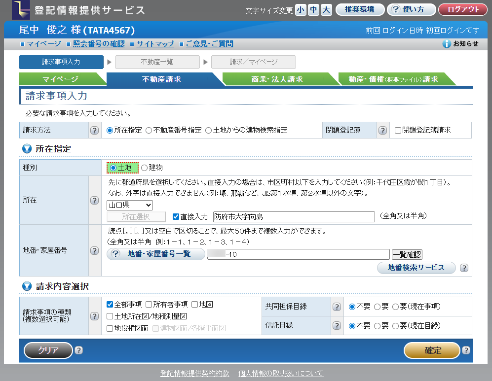 不動産請求に地番が入るので、全部事項をチェックして[確定]します。