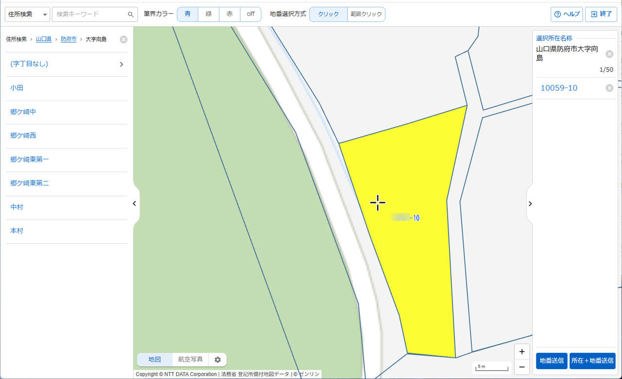 所在地を入力して、地図の調べたい場所を選ぶと地番が表示されます。目的の場所の地番を選んで[所在+地番送信]を行います。